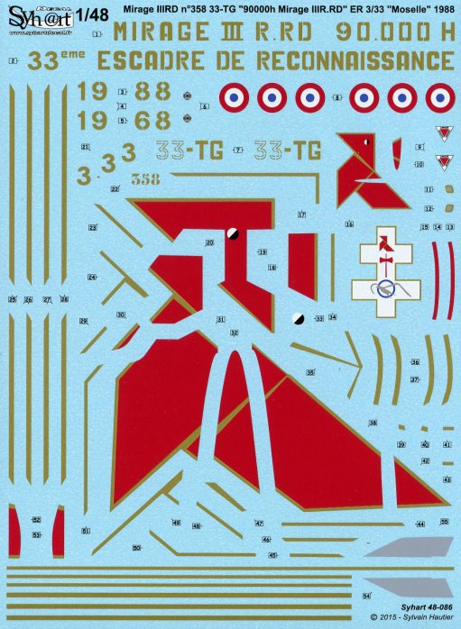 Syhart - 1/48 Mirage IIIRD 33-TG "90000h Mirage IIIR.RD" ER 3/33 Moselle 1988 On 1988, the lasts Mirage IIIR and RD are near to be retired of French Air Force. The reconnaissance squadron ER 3/33 "Moselle" based on Airbase 124 of Strasbourg-Entzheim is then on conversion on Mirage F-1CR. For the event of 90000 Flight hours on Mirage IIIR et RD, and their next retirement, the Mirage IIIRD #358 is specially black painted with gold marks and large BR11 "Cocotte" badge on bottom side. This decals set contain all markings to complete this aircraft. Two options are included, permitting the choice to complete the "cocotte" by decals or by paint. The Mirage IIIRD is a version of Mirage R equiped with doppler radar of Mirage IIIE installed under the nose.