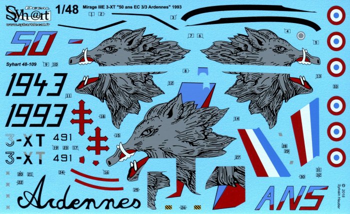 Syhart - 1/48 Dassault Mirage Iiie 3-XT '50 years Ec 3/3 Ardennes 1993' The squadron 'Ardennes' was officially born in October 1943 in Lebanon, as a Fafl (Free French) squadron with an endowment of some Hurricanes Iic from the Royal Air Force, then equipped with P-47 from August 1944 until 1946.