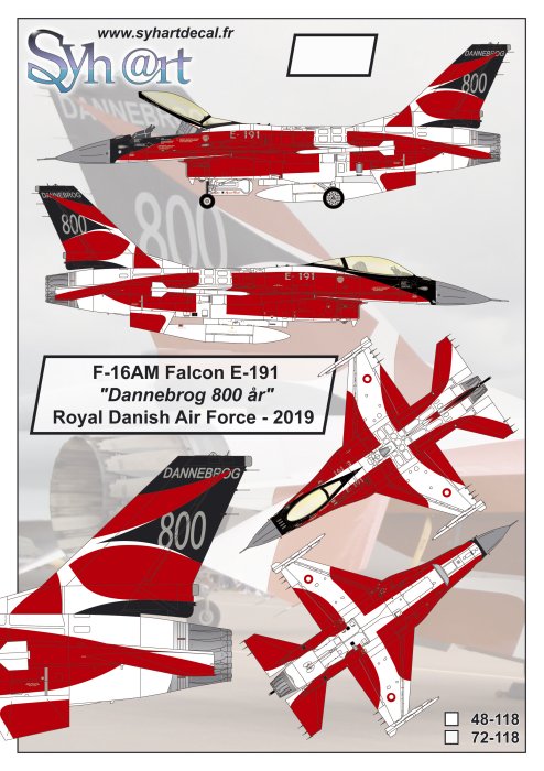Syhart - 1/48 General-Dynamics F-16AM Falcon E-191 Dannebrog 800 ar Royal Danish Af 2019. The flag of Denmark (Dannebrog) is the oldest national flag of the world, according to the legend it would have appeared in the sky on June 15, 1219 during a battle.