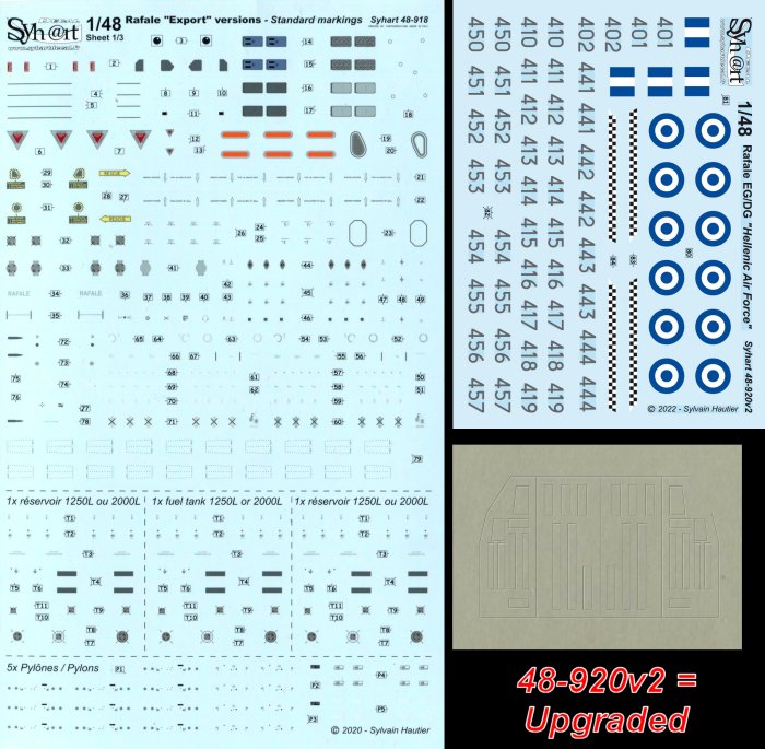 This decal set is an updated version at 1/48 or 1/72 of the Syhart 920 set released on 2022, it allows to accurately reproduce any of the Greek Rafales Eg or Dg including two sets of roundels, flags and squadron checkerboard fin flash.