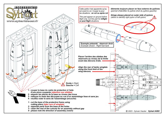 They are hollow in order to be light once placed under the wings, and do not have any irregularity due to printing. The engravings of the welds are finely reproduced in relief such as the real welds, the various hatches and plugs are finely engraved on all the faces, finally the fins are thin but solid. The assembly is protected in a 'cage' allowing transport and storage of the kit without breakage, in particular the fins.