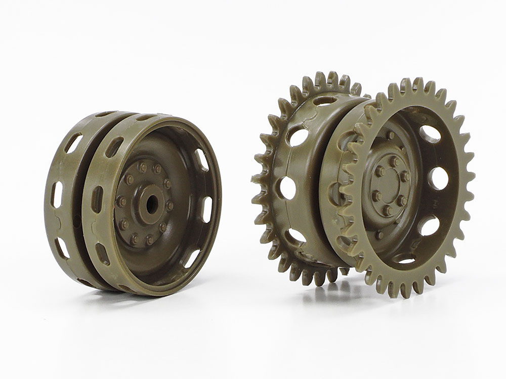 - Right: Recreations of idler wheels and drive sprockets feature depictions of the distinctive holes in their rim sections.
