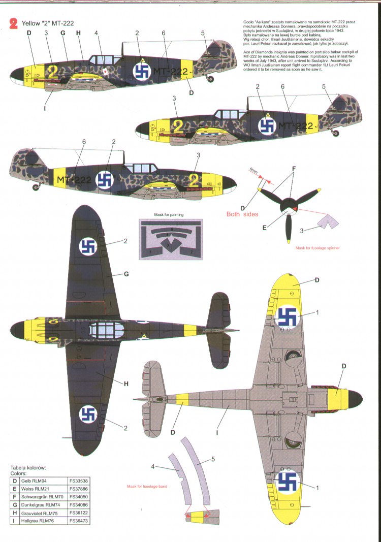 Techmod - 1/24 Messerschmitt Bf-109G-2 in Finnish service (3) DL+IC in delivery scheme and two versions as Yellow 2 MT-222 with 1/LeLv 34. Inc canopy and spinner paint masks