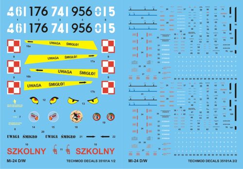 Techmod - 1/35 Mil Mi-24D/W [Mi-24W] Mi-24D "Hind-D", "461″, Polish Army Aviation, Operation "Iraqi Freedom", Ad Diwaniyah, Iraq 2007 Mi-24D "Hind-D", "015″, Training Center of Engineering and Aviation, Polish Air Force, Oleśnica, Poland 2001 Mi-24W "Hind-E", "956″, Polish Army Aviation, ISAF, Ghazni, Afghanistan 2013 Mi-24D "Hind-D", "176″, Polish Army Aviation, 49th Air Base, Poland 2012 Mi-24W "Hind-E", "741″, 56th Attack Helicopters Regiment, Polish Army Aviation, Inowrocław, Poland 2002