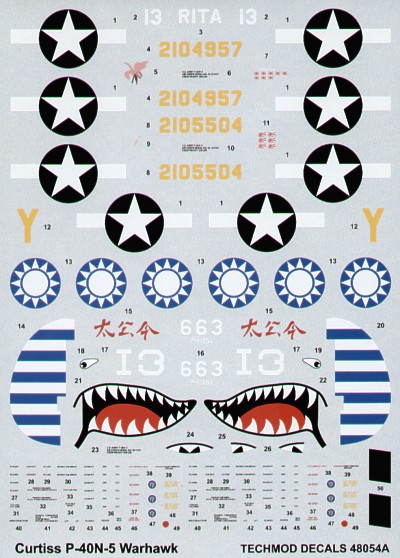 Techmod - 1/48 Curtiss P-40N Warhawks (3) 2104957 White 13 7 FS/49FG Lt DeHaven New Guinea 1944, 2105504 Yellow Y 35 FS/48 Fg Capt Lee West New Guinea 1943, both with White tails, White 653/13 7 FS/3 Fg Chinese Air Force shark mouth.