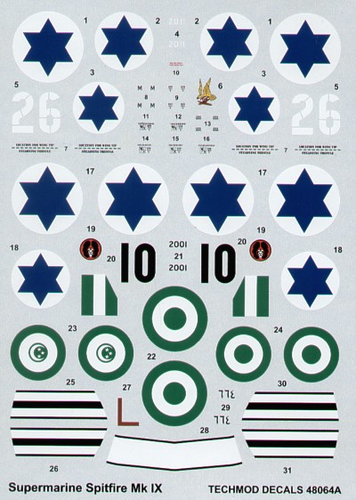 Techmod - 1/48 d! Supermarine Spitfire Mk.IX (3) White 26 camouflage schemes 1949; Black 10 silver. both 101 Sqn Israeli Air Force. L Royal Egyptian Air Force 1948. Inc canopy and rudder paint masks