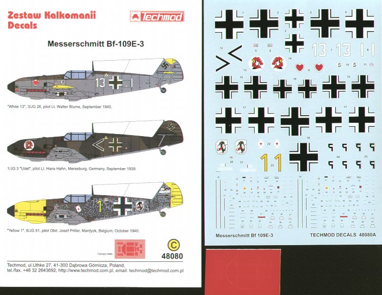 Techmod - 1/48 Messerschmitt Bf 109E-3 (3) White 13 3/JG26 Lt Walter Blume 1940 RLM 02/72/65,
