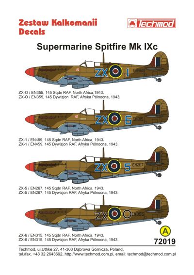 Techmod - 1/72 Supermarine Spitfire Mk.IXc (4) 145 Polish Sqd North Africa 1943. EN459 ZX-1, EN355 ZX-O, EN267 ZX-5, EN315 ZX-6. All Dark Earth/Mid Stone/Azure Blue camo