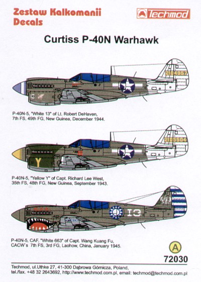 Techmod - 1/72 d! Curtiss P-40N Warhawks (3) 2104957 White 13 7 FS/49FG Lt DeHaven New Guinea 1944; 2105504 Yellow Y 35 FS/48 FG Capt Lee West New Guinea 1943; both with White tails; White 653/13 7 FS/3 FG Chinese Air Force shark mouth.