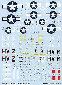 Techmod - 1/72 Republic P-47D Thunderbolt 'Razorback' (4) 275242 LM-K 62FS Capt M. Quirk Halesworth. camouflage, 226044 HV-Z 61FS Maj Leslie Smith 'Silver Lady' Boxted. Natural metal. 275510 HV-A 61FS Lt.Col. F. Gabreski Halesworth. camouflage, 225836 HV-M 61FS Capt M. Gladych. 'Pengie III' Boxted. Nat