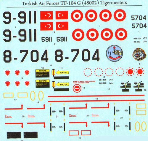 Tigerhead Decals - 1/48 Scale Turkish Air Forces Lockheed F-104/TF-104G. Turkey is one of the very first countries to receive the F-104Gs within the Map program. As a preparation for the new aircraft the 144th Squadron was organised at the 4th Ab in M?rted-Ankara. The first 15 aircraft arrived on May 10th,1963 by sea and they were deployed at the newly founded squadron in July. In July 1963 two TF-104gs arrived and they were also assigned to the same squadron. This was followed by Canadair produced 18 F-104Gs and 2 TF-104Gs. The shipment continued in 1965 with 5 more Canadair built F-104Gs. All of these planes were deployed at the 144th Squadron. In 1968 3 pcs F-104G and 1 pc TF-104G were received from USAF.
