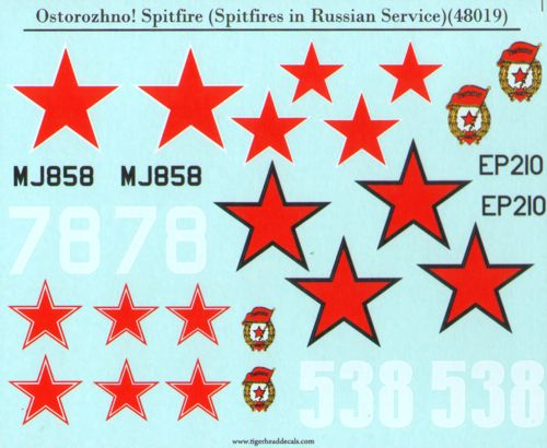 Tigerhead Decals - 1/48 Spitfires in Russian Service Along with British Hurricanes, the Soviet Air Force (voyenno-vozdushnyye sily--VVS) also managed to fly another aircraft of the Royal Air Force as a front-line fighter--the Spitfire Mk. Vb. In the West this airplane is feted as the winner of the Battle of Britain, and is also a national symbol of World War II. In the skies of Russia these fighters became participants in 1943 of the bloodiest battles over the Kuban. Two front-line fighter aviation regiments of the Soviet VVS--57th Guards Fighter Aviation Regiment (GIAP) and 821st Fighter Aviation Regiment (IAP)--were re-equipped with the Spitfire Mk. Vb. It was the 57th GIAP that first entered combat with the enemy in these fighters, in May 1943. Earlier the regiment was known as the 36th IAP, and was formed in Baku in 1938. Pilots flew the regiment's first combat sortie under the command of Major Aleksandr Alekseevich Osipov on 27 November 1941 as part of the 72d Fighter Aviation Division (IAD) (later the regiment was subordinated to the 237th IAD). The regiment fought in the Southern, Crimean, and North Caucasus fronts until 15 November 1942. It is possible to make 3 full profiles. - Spitfire Mk.Vb 57 GIAP Kuban 1943 - Spitfire Mk.IXe 26 GIAP Leningrad 1944-1945 - Spitfire Mk.IXc MJ858