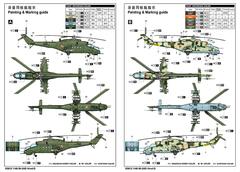 Trumpeter - 1/48 Mil Mi-24V Hind-E Mi-24V / Mi-35 'Hind E' Mi-24V (Hind-E) is another improved version, a development of Mi-24D. The major change consists in the upgraded and more efficient Shturm V missile system with 9M114 (AT-6 Spiral) radio-guided anti-tank missiles launched from two pairs of cylindrical pods mounted on wingtips. Also added were B-8V rocket pods for 20 80 mm S-8 rockets, UPK-23-250 pods with two-barrel Gsh-23L and 250 rounds, GUV9A universal pods which can carry a 30 mm 9-A-800 automatic grenade launcher, or one 12.7 mm 9-A-624 four-barrel machine gun and two four-barrel 7.62 mm 9-A-622 machine guns. It was equipped with TV3-117V engines with improved height characteristics and optional exhaust mixer boxes to cool exhaust gasses, and auxiliary fuel tanks with a capacity of 450 litres. Since the War in Afghanistan, Mi-24Vs received radar homing and warning system (RHAWS), infra-red countermeasures (IRCM) and an active Ircm jammer. These equipments were also fitted to some late Mi-24Ds, which have sometimes been refered to as Hind Ds Mod. The degraded version exported outside the Warsaw Pact was called Mi-35.