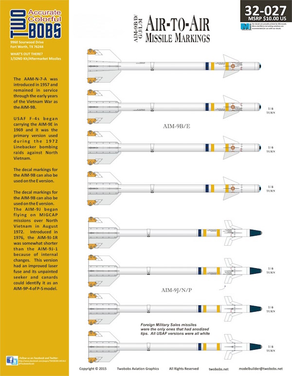 Two Bobs - 1/32 US Air-to-Air Missile Markings for AIM-9B/D/G/J/L/M and AIM-7E-2/M. Now you can smarten up the missiles on your model with authentic coloured bands and markings etc