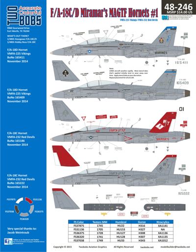 Two Bobs - 1/48 McDonnell-Douglas F/A-18C/D Miramar MAGTF Hornets The newest schemes from the VMFA (AW)-225 Vikings and VMFA-232 Red Devils are featured on this sheet. Markings for the CO jet and a line jet from the respective squadrons are included in this product. There are enough stencils on this sheet to build 2 of the 4 jets depending on the combination that you choose. Stencil markings for the Litening Targeting Pod are also included! Decals are sized to the Hasegawa kits. Recommended Kits: Hasegawa F/A-18C Hasegawa F.A-18D Monogram F/A-18C Hobby Boss F/A-18C Aires Accessories Airwaves Cockpit Avionix Resin Cockpit Eduard Accessories G-Factor Wing Fold Set Steel Beach Intake/Exhaust