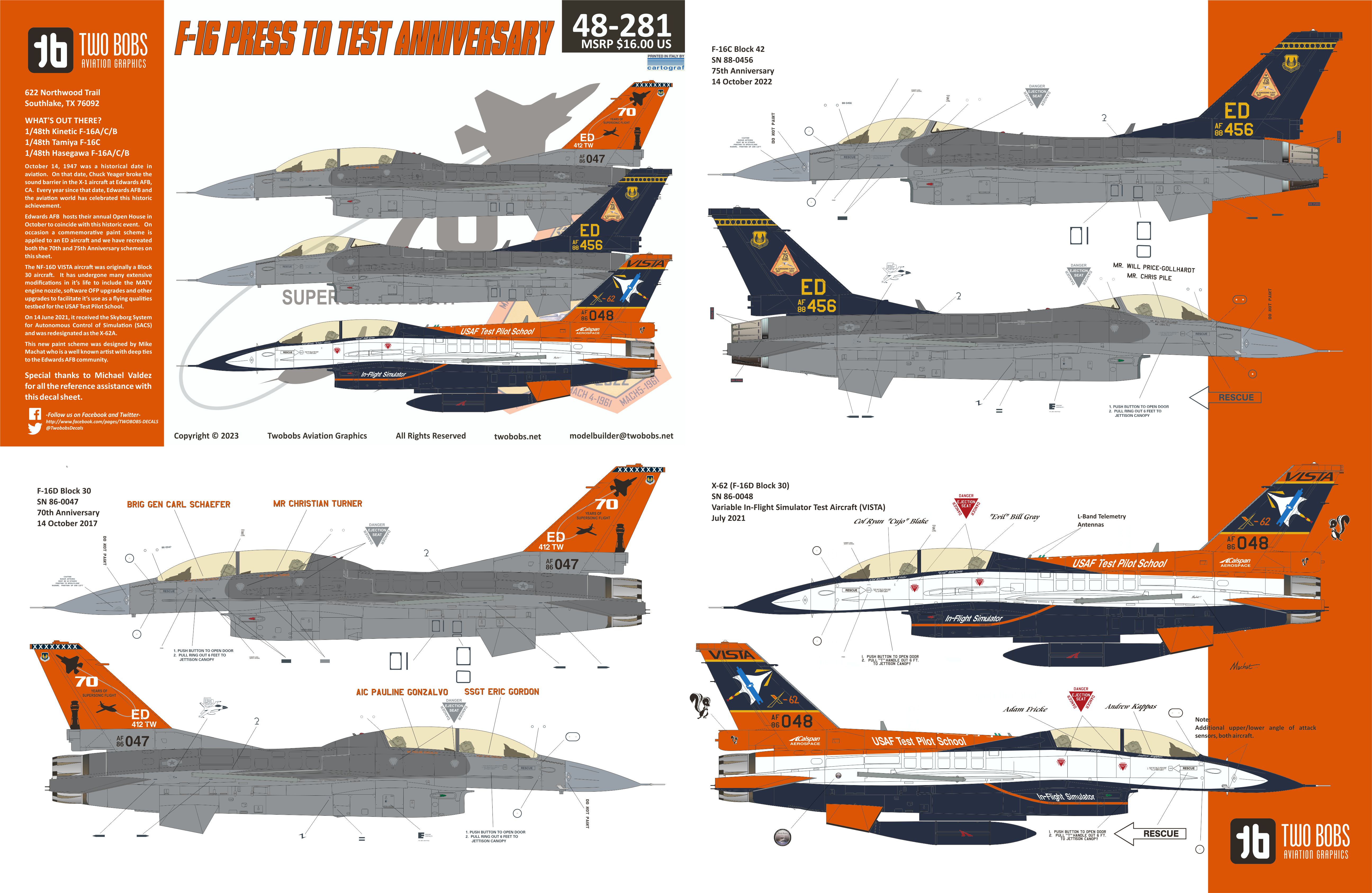 Two Bobs - 1/48 F-16 Press to Test Anniversary. October 14, 1947 was a historic date in aviation. On that date, Chuck Yeager broke the sound barrier in the X-1 aircraft at Edwards AFB, CA. Every year since that date, Edwards Afb and the aviation world has celebrated this historic achievement.