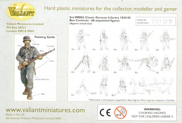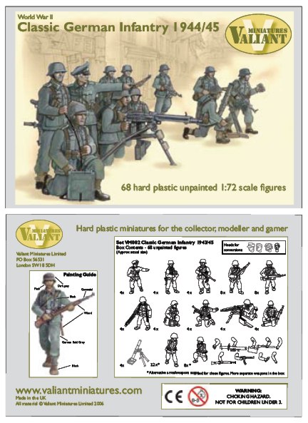 Valiant Miniatures - 1/72 German (WWII) Infantry 1944-45. 68 hard plastic figures. Unlike the image often portrayed by Hollywood the backbone of the German Army was the largely horse-drawn infantry division. Although these formations may now seem very primitive compared to the fully mechanised British, Canadian and American forces this criticism cannot be made of German equipment.