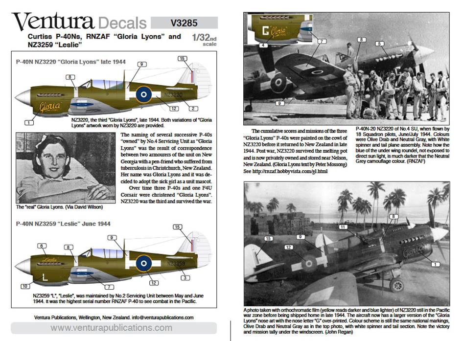 Ventura - Rnzaf Curtiss P-40Ns, Gloria Lyons and Leslie 1/32nd scale decal