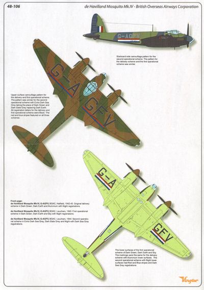 Vingtor Decals - 1/48 De Havilland Mosquito Mk.IV British Overseas Airways Corporation G-AGFV in choice of 3 schemes. Dk.Green/Dk.Earth/Silver, Dk.Earth/Dk.Green/Sky, Extra Dk.Sea Grey/Dk.Slate Grey/Night Black.