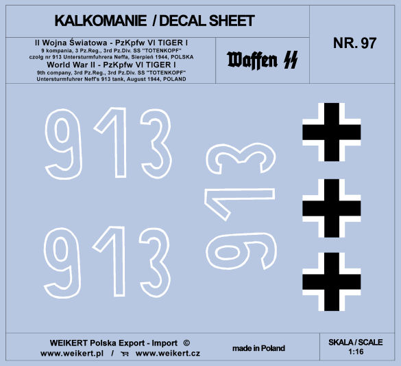 WEIKERT DECALS - 1/16 PzKpfw. VI TIGER I 913 tank Unt.Neff, 1944 decal