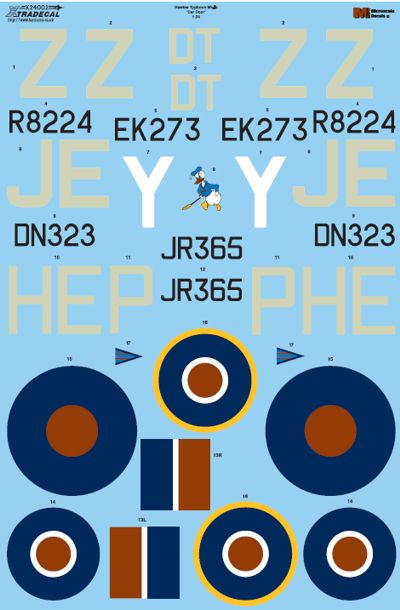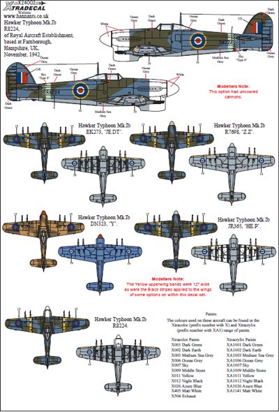 Xtradecal - 1/24 Hawker Typhoon Mk.Ib Car Door (5) JR365 HE-P 263 Sqn RAF Harrowbeer 1944, R7698 Z-Z 609 Sqn Wng/Co Denis E.Gillan RAF Duxford 1942, DN323/Y 451 (RAAF) Sqn Egypt 1943, DE/Stone/AB, EK273 JE-DT 195 Sqn S/L Don Taylor RAF Ludham 1943, R8224 Royal Aircraft Establishment, Farnborough 1942 with white nose