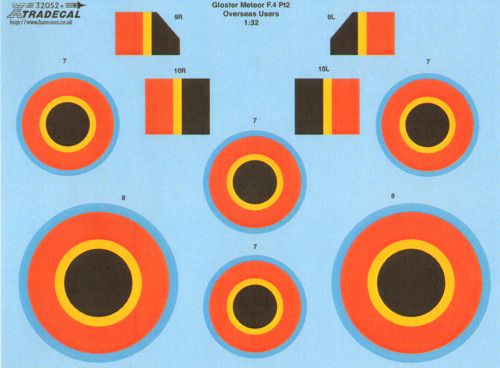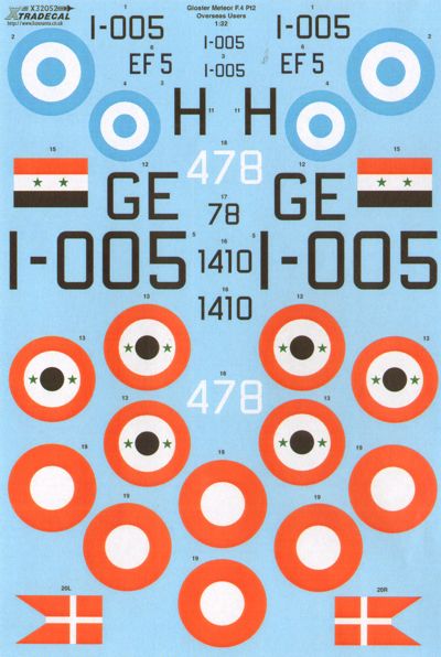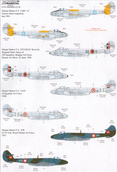 Xtradecal - 1/32 Scale Gloster Meteor F.4 with Overseas Operators (4) Fuerza Aerea Argentina I-005 with yellow trim 1961; Belgian Af EF5 GE-H 49 Sqn flown by Sgt Harry Saeys at Deurne Air Show 25 June 1950; No 141 Egyptian Af 1958; No 478 723 Esk, R. Danish Af 1951 camouflaged.