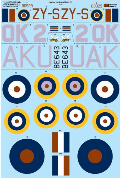 Xtradecal - 1/32 Hawker Hurricane Mk.IIc Pt 1 (3) BE643, AK-U P/O A.U.Houle 213 Sqn, Edku, Egypt, April, 1942. BD929, ZY-S 247 (China-British) Sqn,RAF Exeter,1942. possibly Z3574 OK-2 personal aircraft of Air Vice Marshal Keith R. Park, AOC Malta, RAF Luqa, Malta 1942.