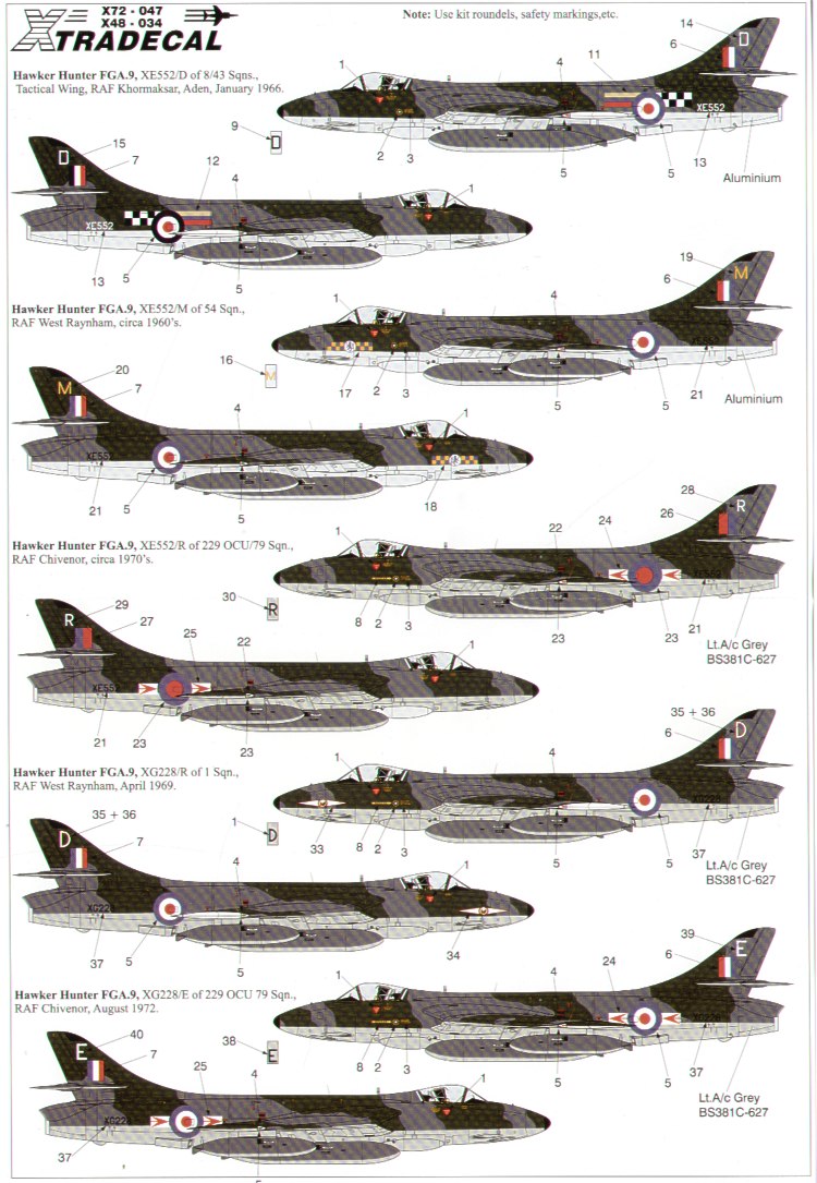 Xtradecal - 1/48 Hawker Hunter FGA.9/FR.10 (7 Sqns 3 a/c) XE552/M 54 Sqn, D/8/43 Sqns, R/229OCU/79 Sqn all r/w/b roundels, XG228/D 1 Sqn, E/229OCU/79 Sqn, 56/ 1TWU red/blue National Insignia/Roundels (the last Hunter in service), FR10 XJ633/S 2 Sqn, K/ 4 Sqn r/w/b roundels