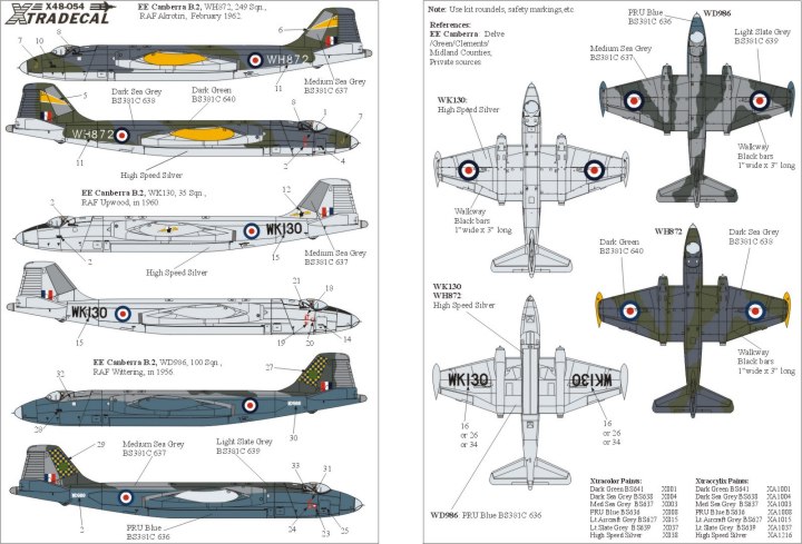 Xtradecal - 1/48 BAC/EE Canberra B.2 Part 2. (3) WH872 249 Sqn Raf Akrotiri 1962 Camouflaged Dark Green/Dark Sea Grey/Silver, WK130 35 Sqn Raf Upwood 1960 Overall High Speed Silver, WD986 100 Sqn Raf Wittering 1956 Camouflaged Med Sea Grey/Lt Slate Grey/PRU Blue