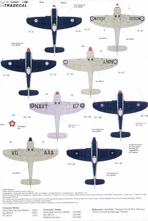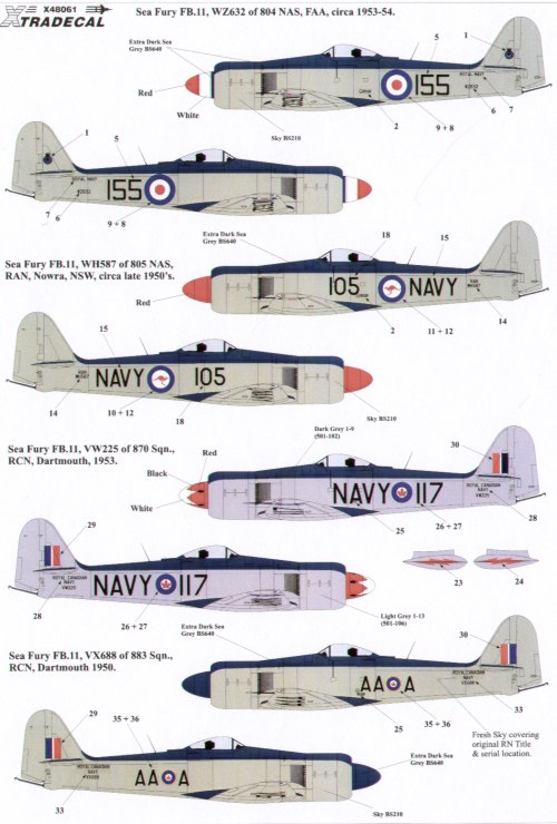Xtradecal - 1/48 Hawker Sea Fury FB.11 (4) WZ632/155 804 Nas 1953, WH587/105 805 Nas Ran Nowra Nsw 1950, VW225/117 870 Sqn, VX688 AA-A 883 Sqn. Both R Canadian Navy, Dartmouth 1950s