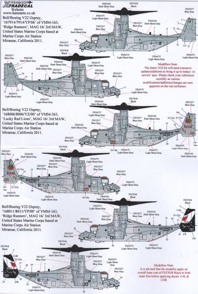Xtradecal - 1/48 Bell-Boeing V22 Osprey (4) 167914 YP/06 VMM-163 Ridge Runners lo-viz; 168006 YZ/00 VMMM-363 Lucky Red Lions; 168011 YP-00 VMM-163 Ridge Runners coloured markings; 168022 PH/o5 VMM-561 Pale Horse lo-viz. All MCAS Miramar 2012. With full data markings.