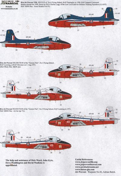 Xtradecal - 1/48 BAe Jet Provost T.5 Pt 1 (11) XW290 in three slightly different schemes with the Red Pelicans Display Team at the CFS Little Rissington from 1970, 1972, 1973 and 3 FTS RAF College Cranwell 1988; XW370/49 The Swords Display Team 3 FTS RAF Leeming 1974; XW370/72 1 FTS RAF Linto-on-Ouse 1980s; XW322/1 RAF College Cranwell 1971 used by HRH Prince of Wales for his flying training; XW322/43 RAF Cranwell 1984; XW325/E 6 FTS RAF Finnigley 1990 RAF Support Command Display aircraft flown by FLt.Lt.Darren Legg; XW370/49 3 FS 1972 or 1973 one of the Gemini Pair For FLY kit. In preparation. Jet Provost T.5/T.5A