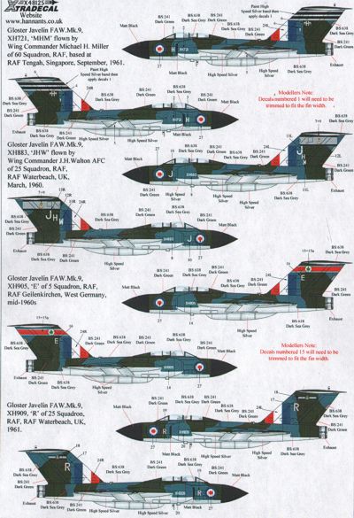 Xtradecal - 1/48 Scale Gloster Javelin Faw Mk.9 Part 1 (5) XH721 Mhm flown by Wing Co Michael Miller 60 Sqn Raf Tengah 1961; XH883 25 Sqn Raf Waterbeach 1960; XH905/E 5 Sqn Raf Geilenkirchen 1960s; XH909/R 25 Sqn Raf Waterbeach 1958; XJ122/E 85 Sqn Raf West Raynham