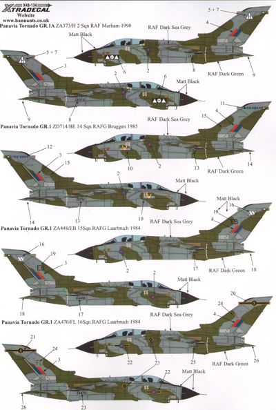 Xtradecal - 1/48Panavia Tornado GR.1/GR.1A Pt.1 (6) ZA373/H 2 Sqn RAF Marham 1990, ZD714/BE 14 Sqn RAFG Bruggen 1985, ZA448/EB 15 Sqn RAFG Laarbruch 1984, ZA470/FL 16 Sqn RAFG Laarbruch 1984, ZA600/CM 17 Sqn RAFG Bruggen 1985, ZA411 AJ-S 617 Sqn RAF Marham 1989. All overall green/dk sea grey camo.
