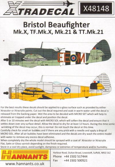 Xtradecal - 1/48 Bristol Beaufighter Mk.X, TF Mk.X, Mk.21, TT Mk.21 (5) Due Mid May. Mk.X KW393/W 27 Sqn Burma 1945, =TF Mk.X LZ451 EE-M 404 Sqn RCAF Wg/Co Alfred Kitchener Gatward DSO D-Day stripes RAF Strubby 1945, = NE425 2-G 404 Sqn RCAF RAF Davidstow Moor, Cornwall 1945, Mk.21 A8-112 SK-L 93 Sqn RAAF Morotai Island, Borneo 1945 TT Mk.21 A8-357 30 (TT) Sqn Air Trials Unit RAAF Woomera 1957,