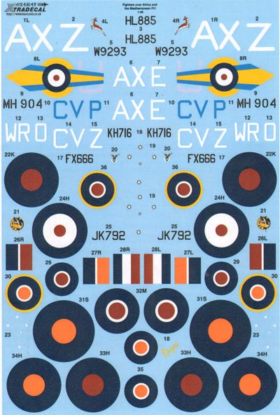 Xtradecal - 1/48 Fighters over North Africa and the Mediterranean Pt.1 (6) Hawker Hurricane Mk.IIc Tropical version HJ885 AX-Z 'Oops' 1 Sqn SAAF 258 Wing based LG.128 1942, Hurricane Mk.I Trop W9293/U 73 Sqn Nth Africa 1942, Supermarine Spitfire Mk.Vb Trop JK792 60 Sqn SAAF Italy 1944, Spitfire Mk.IXc MH904 AX-E 1 Sqn SAAF Italy 1944, North-American P-51D Mustang Mk.IV KH716 CV-P 3 Sqn RAAF Italy 1945, Curtiss P-40 Kittyhawk Mk.IV FX666 CV-Z 450 Sqn Lesi, Italy 1944.