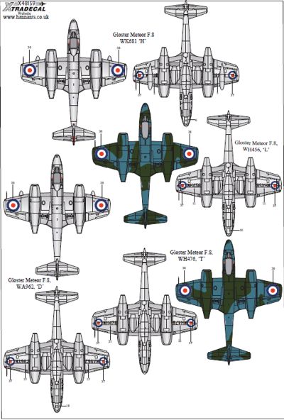 Xtradecal - 1/48 Gloster Meteor F.Mk.8 Collection Pt 2 (7) VZ494 501 Sqn R.Aux.AF RAF Filton 1957, WA962/D 41 Sqn RAF Biggin Hill 1950s, WH456/L 616 Sqn R.Aux.AF RAF Finningley 1950s, WH464/F 504 Sqn R.Aux.AF RAF Wymeswold 1953, WH476/T 89 Sqn RAF Stradishall 1956, WK681/H 65 Sqn Aerobatic Team Duxford 1953, WK815/R Target Towing Sqn RAF Sylt, Germany 1959,