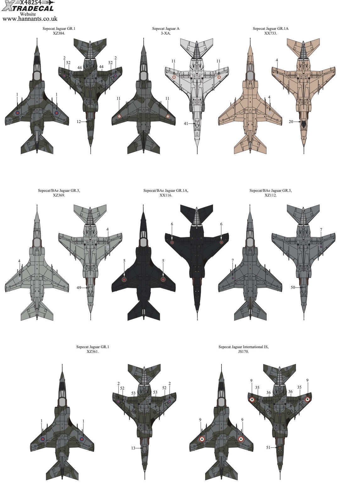 Xtradecal - 1/48 Sepecat Jaguar GR.1/GR.1A Part 1 7Sepecat Jaguar GR.1 XZ384/'CM' of 20 Squadron Royal Air Force, based at Raf Br?ggen, Germany, 1982.Sepecat Jaguar GR.1A XX733/'R' of Royal Air Force, based at Thumrait Air Base, Oman & Muharraq Air Bases, Bahrain, 1991.Sepecat Jaguar A 3-XA/'A6' of Escadron de Chasse 3/3 'Ardennes' Armee de l'air, based at Nancy-Ochey, France, 1985.Sepecat/BAe Jaguar GR.3, XZ369/'EF' of 6 Squadron Royal Air Force, based at Raf Coltishall, used in 'Operation Telic', 2005.Sepecat/BAe Jaguar GR.1A, XX116 of 16R Squadron Royal Air Force, based at Raf Lossiemouth, June, 1995.Sepecat/BAe Jaguar GR.3, XZ112/'GW' of 54 Squadron Royal Air Force, based at Raf Coltishall, 2005.Sepecat Jaguar GR.1 XZ361/'T' of 41 Squadron Royal Air Force, based at Raf Coltishall, UK, 1993.Sepecat Jaguar International IS, JS170 of 14 Squadron Indian Air Force, based at Afs Ambala, India, late-1980s.