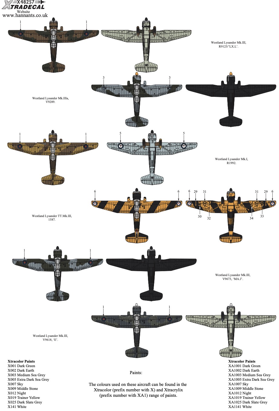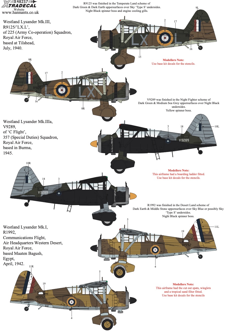 6 Westland Lysander Mk.III, R9125/'LX.L', of 225 Army Co-operation Squadron, Royal Air Force, based at Tilshead, July, 1940.Westland Lysander Mk.IIIa, V9289, of 'C Flight', 357 Special Duties Squadron, Royal Air Force, based in Burma, 1945.Westland Lysander Mk.I, R1992, Communications Flight, Air Headquarters Western Desert, Royal Air Force, based Maaten Bagush,Westland Lysander TT.Mk.III, 1587, of No. 3 Operational Training Unit, Western Air Command, Royal Canadian Air Force, based at R.C.A.F. Station Patricia Bay, British Columbia, Canada, 1942 .Westland Lysander Mk.III, V9673, 'MA.J' Flown by Group Captain Hugh Verity of 161 Special Duties Squadron, Royal Air Force, based at Raf Tempsford, 1942.Westland Lysander Mk.III, V9618, 'E' 754 Naval Air Squadron, Royal Navy, based at Rnas Arbroath, September, 1941.