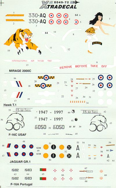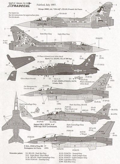Xtradecal - 1/72 Riat Fairford 1997 Was 5.99. Temporarily Save 1/3RD!!! (5) Dassault Mirage 2000C No 64 330-AQ Ceam 'Remove Before Take Off', BAe Hawk T.1 XX193/CB 100 Sqn Overall Black, Sepecat Jaguar GR.1 X391/A 16(R) Sqn Raf Lossiemouth, General-Dynamics F-16A Fighting Falcon 15102 Esq 201 Portuguese Air Force, Lockheed-Martin F-16C 89-050 510FS 31FW Aviano 50th Anniversary scheme