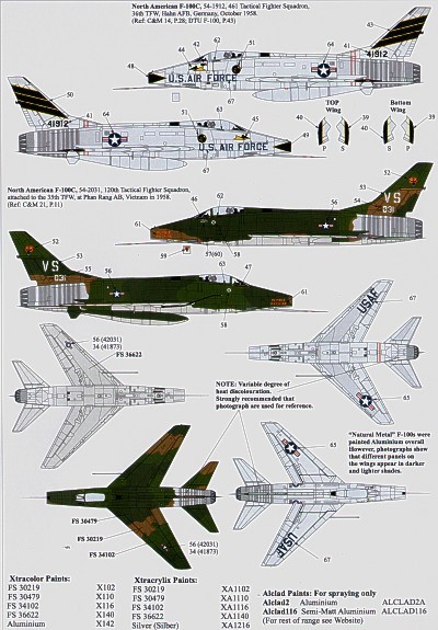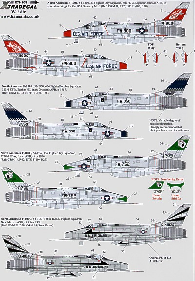 Xtradecal - 1/72 . North-American F-100C Super Sabre (6) 54-1800 333rd FDS/4th FDW Seymour-Johnson AFB 1958 special Gunnery Meet markings, 53-1950 454th FBS/323rd FBW Bunker Hill (now Grissom) AFB 1957, 54-1752 452nd FDS/322nd FDW Foster AFB 1956, 54-1873 452nd FDA/322nd FDW New Mexico ANG, 54-19123 461st TFS/36th TFW Hahn AFB 1958, 54-2031/VS 120th TFS/35th TFW Phan Rang AFB Vietnam SEA Camo.