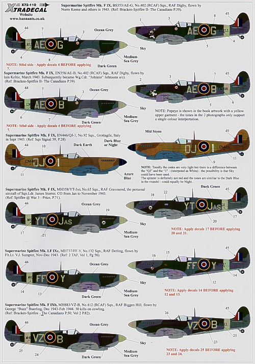 Xtradecal - 1/72 Scale Reprinted! Supermarine Spitfire Mk.IXc (9) BS353 AE-G Norman Keene; EN358 AE-B Ian Keltie later Wg.Cdr.Jonnie Johnson. Both 402 (RCAF) Sqn Raf Digby 1943; EN446 QJ-I 92 Sqn Italy 1943; MH358 YT-JAS Sqn.Ldr James Storer Co 1943; MH737 FF-Y 122 Sqn Flt.Lt. V.J.Sumpter Raf Detling 1943; MJ883 VZ-B 412 (RCAF) Sqn George Buzz Buerling 30 kills 1944; MJ532 UF-G 43 Sqn Italy 1944; MK126 5J-G 126 Sqn Raf Harrowbeer 1942; MH819 NN-M 310 (Czech) Sqn Raf Appledram June 1944 with full D-Day stripes.