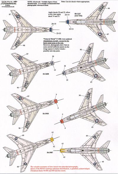 Xtradecal - 1/72 North-American F-100D Super Sabre/North-American F-100F Super Sabre Two Seat Part 2 (8) North-American F-100F 56-3950 1FDS 413DFW Lt.Col Chuck Yeager 'City of Barstow' George Afb 1958, 48-1227 1961, In August 1959 was the first single engine jet to fly over the North Pole or North-American F-100D Super Sabre 55-3608 'OO-HA', both 416TFS 21TFW Misawa AFB, 56-4002 21 Tfw Misawa Afb 1961, 58-18227/CD 524TFS 27TFW Vietnam Wild Weasel 1960, 56-3987 0005 22FBS 4FBW Republic of Chine Air Force Taiwan 1960, 56-3976 G-976 Esk 730 1970s, GT971 56-3971 Esk 727 1970 camo, R. Danish AF.