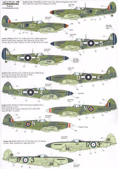 Xtradecal - 1/72 . Supermarine Seafire Mk.II/Mk.III/Mk.XV/Mk.XVII (11) Mk.IIc LR642 8-M 807 NAS HMS Battler 1942, MB249 7-B 880 NAS HMS Indomitable 1943, MB156 O6-G 885 NAS HMS Formidable Operation Torch 1942, Mk.III NN344 K-O 899 NAS HMS Khedive 1944, PP979 D5-X 807 NAS HMS Hunter British Pacific Fleet 1945, NN460 H6-Z 807 NAS HMS Indefatigable 1945, NN621 II-5/N 880 NAS HMS Implacable BPF 1945, Mk.XV SW786 11-4/Y 806NAS HMS Glory 1946, PR494/N 803 NAS R. Canadian Navy HMCS Warrior 1947, Mk.XVII SX365 17-3/JB 736 NAS St.Merryn 1949, FR.47 VP436 141/O 804 NAS HMS Ocean 1947.