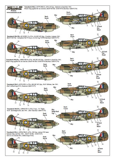 Xtradecal - 1/72 Scale Reprinted. Curtiss P-40B Tomahawk (13) AH179 RM-E 26 Sqn Gatwick 1941; AK185 RU-V 414(RCAF) Sqn Croydon 1941; AH882 KH-A 403(RCAF) Sqn Gatwick 1941; AH784 NM-P 268 Sqn 1941; AH781 SP-S 404(RCAF) Sqn Odiham 1941; AH940 XV-U 2 Sqn. All Dark Green/Dark Earth/Sky. The two Gatwick based had black under port wings for an exercise. AK498 LB-C 250 Sqn Flt Lt Clive Killer Caldwell Raaf 1941; AK461/A 112 Sqn 1941 Shark Mouth; AK431 E-D 77 Otu Aden 1943/44; AN311 TA-C 2 Sqn Saaf Lt Danny Saville downed Mc 200 on 21-11-41; AN377 KJ-B 4 Sqn Saaf Lt Johnny Van Nus probable shared Messerschmitt Bf 109 9-6-42 All North Africa Dark Earth/Stone/Azure Blue; AH899 PB-F 1683 Bombing Defence Training Flt Bruntingthorpe 1943 Dk Green/Ocean Grey/Med Sea Grey; U.S. Army 55 Pursuit Sqn 20 Pursuit Group California 1941 OD/Neutral grey