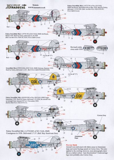 Xtradecal - 1/72 ! Fairey Swordfish Mk.I Part 2 (11) L9777/701 or L9779/702 both 814 NAS HMS Ark Royal March 1939, P3992 G5K 825 NAS HMS Glorious 1939,
