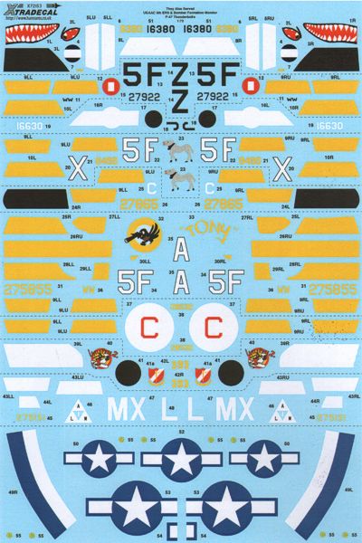 Xtradecal - 1/72 Republic P-47D Thunderbolts. They Also Serve. War Weary Bomber Formation Monitors and 5th Emergency Rescue Squadron (12) 41-6380/WW 448th Bomb Group Raf Seething two versions Mid and Late 1944, 41-6630/J 453rd Bg Raf Old Buckenham 1944, 42-7865/C 44th Bg Raf Shipdham, 42-8532/C 389th Bg Raf Hethel, 42-26393 'Little Pete 2' 467th Bg Raf Rackheath, 42-275151 91st Bg Raf Bassingbourne 1944, all Formation Monitors. 42-27922 5F-Z Raf Halesworth 1945, 42-8496 5F-X 'Galloping Catastrophe', 42-75855 'Tony' 3 versions, All 5th Emergency Rescue Squadron with red/white/blue nose cowl bands based at Raf Boxted.