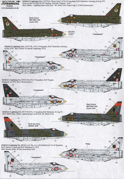 Xtradecal - 1/72 . BAC/EE Lightning (7) Lightning F.2A XN778/A 'KIng Cobra' 92 Sqn CO W/Cdr Ed Durham RAF Gutersloh 1977, XN777/K 19 Sqn RAF Gutersloh 1976, Lightning F.6 XS921/M 74 Sqn RAF Tengah, Singapore 1970, XR727/F 11 Sqn RAF Binbrook 1978, XR761/A 56 Sqn W/Cdr A.L.Buckley RAF Akrotiri and Wattisham 1975, XS919/AL 5 Sqn RAF Binbrooke 1984, XR770/AA 5 Sqn W/Cdr M.V.Streton RAF Binbrooke 1985 with Shark Mouth applied on APC at RAF Akrotiri.