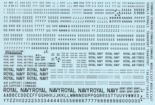 Xtradecal - 1/72 RAF Black Serial Letters and Numbers 4" ,6" ,8" and 12" and titles for Royal Air Force, Royal Navy, Army, Air Support Command etc. This is also available in white as sheet number X72158. Ex MD036B. (RAF codes/RAF code letters/RAF serial numbers)