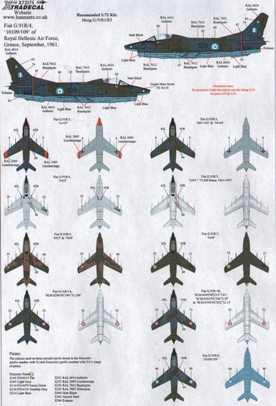 Xtradecal - 1/72 Fiat G.91R/3 (13) Luftwaffe 31+97 Waffenschule, Furstenfeldbruck 1962; MC+103 Leichtes Kempsfgeschwader 43 Oldenberg 1967; 30+68 Kempsfgeschwader 44 Leipheim 1968 all Green/Grey camo; Forca Aerea Portuguesa. 5425 Esquadra 702 'Escorpioes' Mozambique 1970; 5445 75000 Horas 1965-93 Esquadra 301 Jaguares 1993, Both overall natural metal; 5415 Esquadra 303 Tigres 1980s; 5448 Esquadra 301 Jaguares 1986, both overall Dark Green/Tan; 5410 Esquadra 302 Falcões Mozambique 1967-74 overall dark green; Italy 51-296 51a Sqn 1962; 2-01 14 Gruppo 2 Stormo lo-viz 1962; 2-38 103 Gruppo 1980; 13-32 32 Stormo 1970s, all green/grey/aluminium camo; R. Hellenic AF 10109/109 1961 green/grey/blue camo.